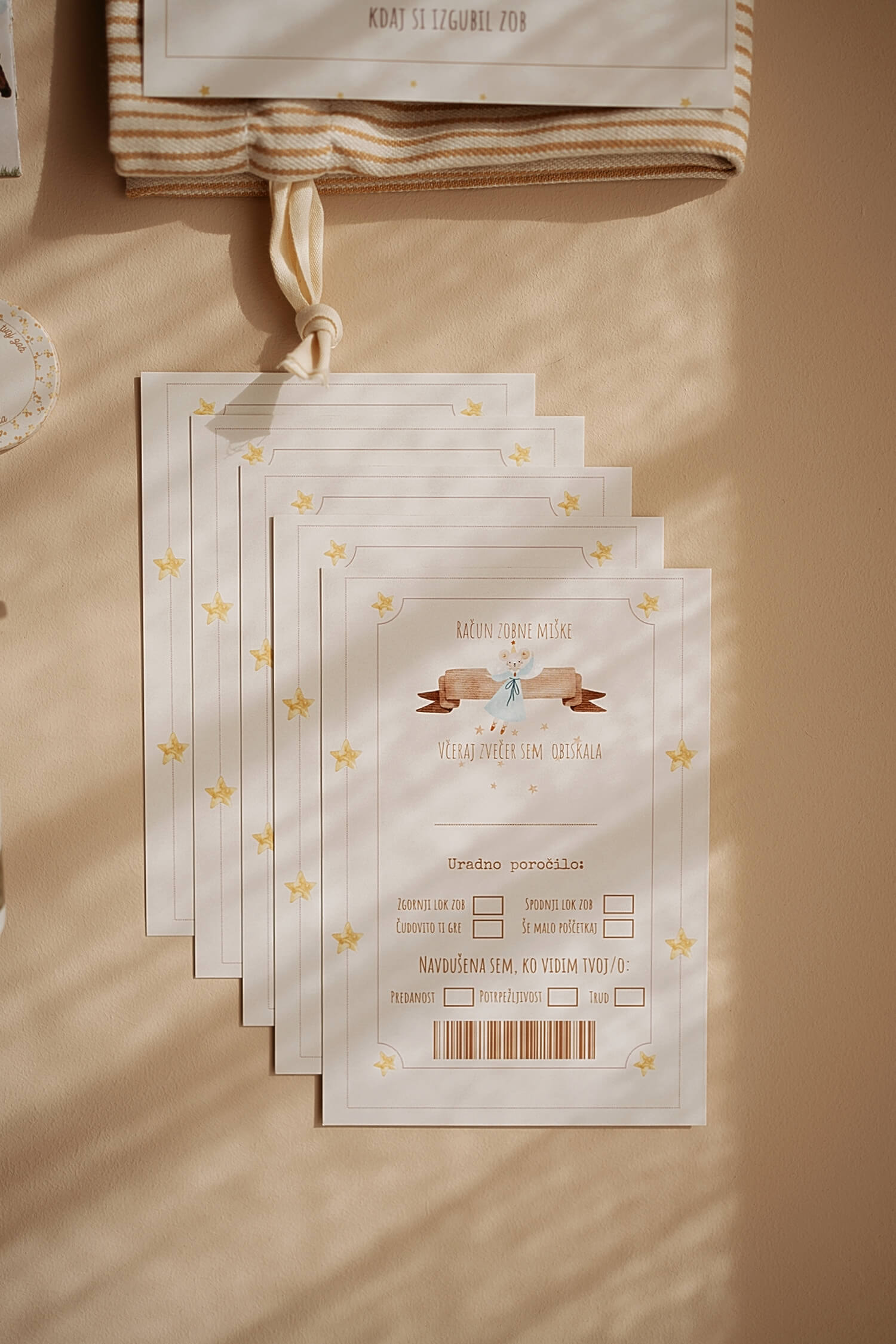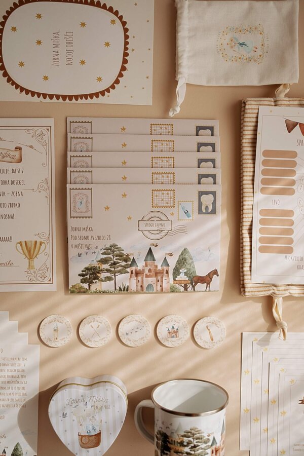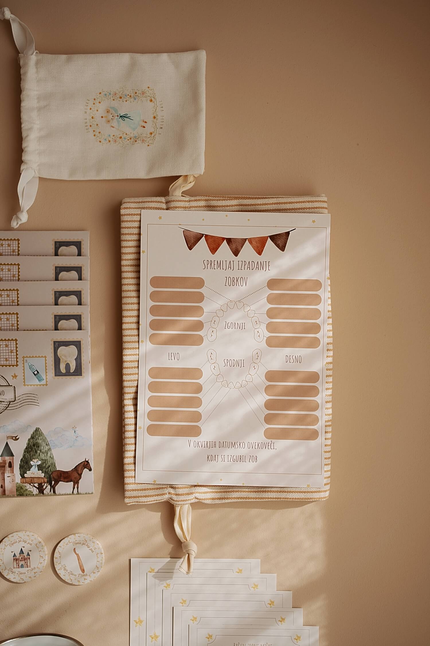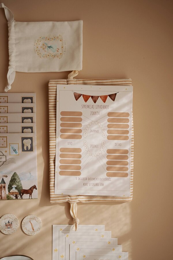 Imamo že 3 pakete, ker imamo 3 otroke in zobje izpadajo na vse strani 😊 Vse je organizirano in pripravljeno – pisma, računi, celo majhni žetoni, ki jih lahko uporabljamo za nagrade.